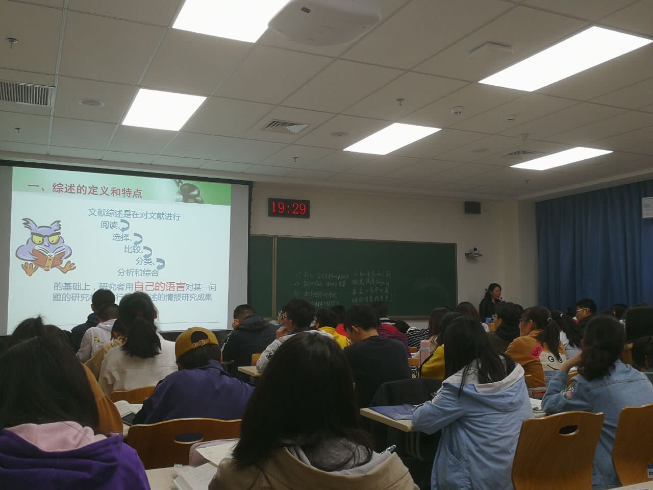 刘老师就科技论文的概念及特点,从创造性、科学性和规范性四个方面来具体说明科技论文的写作要领,并通过对一些事例和论文的分析,令大家更加了解科技论文的作用。随后刘老师从文献综述概述、样例和写法、写作过程及写作格式四个方面详细地讲解了怎样写出一篇规范的、有价值的文献综述,同时,也想学生强调学术论文诚信的重要性,论文综述不是简单的文献叠加,要有自己的思考与整理。